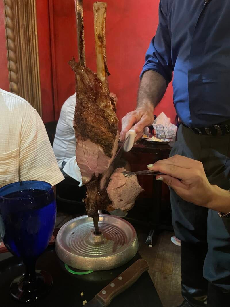 Zoals op de foto te zien is kwamen ze aan tafel en kon je zelf aangeven hoe groot of wel deel van het vlees je wou. Het werd van de spies gesneden en met een tangetje kon je het dan aanpakken.